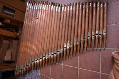 Spitzflöte 8' Das Foto zeigt nur einen kleinen Teil der Pfeifen. Weitere Fotos können auf Anfrage gemacht werden.