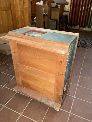 großer Windregler Laukhuff Rol... Rollventil aus Kiefer (oder grau lackiert) mit Rolle und Schnur, Höhe 410mm Breite 290mm, Tiefe 215mm